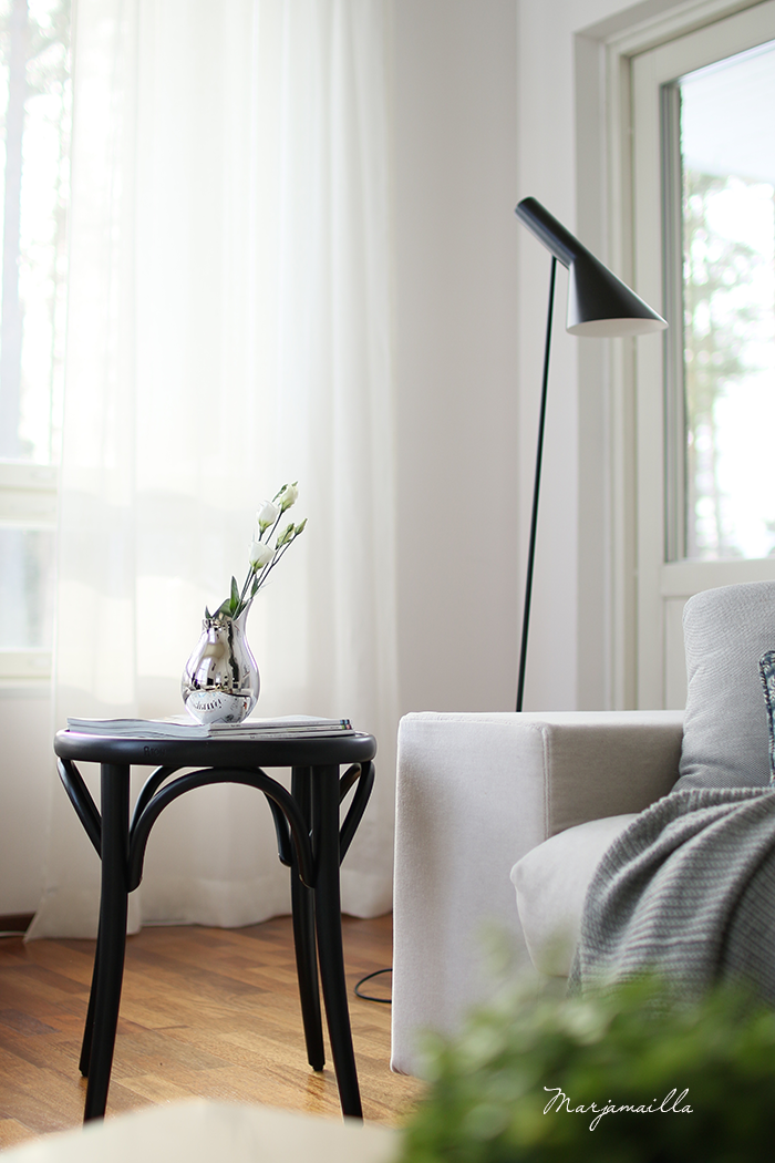 Olisi kuitenkin vielä maltettava hetki ja iloittava lisäntyneestä valon määrästä. Yritän saada ajatukset tähän hetkeen ja nauttia kodin lämmöstä, kun tuuli viuhuu ja tekee säästä entistäkin koleamman. Nauttia kukista sisällä, jotka on tällä kertaa hiukan herkempiä. Siniset helmilijat istutin aaltoon ja eustomat loistaa keittiön tasolla vanhassa pullossa.